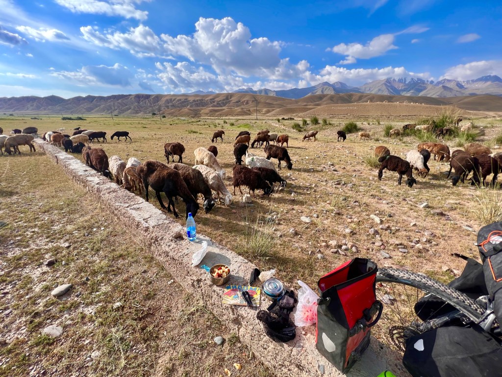 Zum anderen war es die Begegnung mit vielen Einheimischen entlang der Straße, die mir immer freundlich grüßten, helfen wollten und immer sehr interessiert an mir waren. Etwas, was ich bereits jetzt in Deutschland vermisse, ist, dass man sein Gegenüber sieht und wahrnimmt, anstatt bedeutungslos nebeneinander her zu leben und ihm kein Lächeln zu schenken. Der Hirte Bacha, der mich vor potentiellen Wölfen beschützen wollte, zeigte mir Kirgisische Gastfreundschaft und wie sich das Leben als Hirte mit seinen Ziegen so gestaltet.