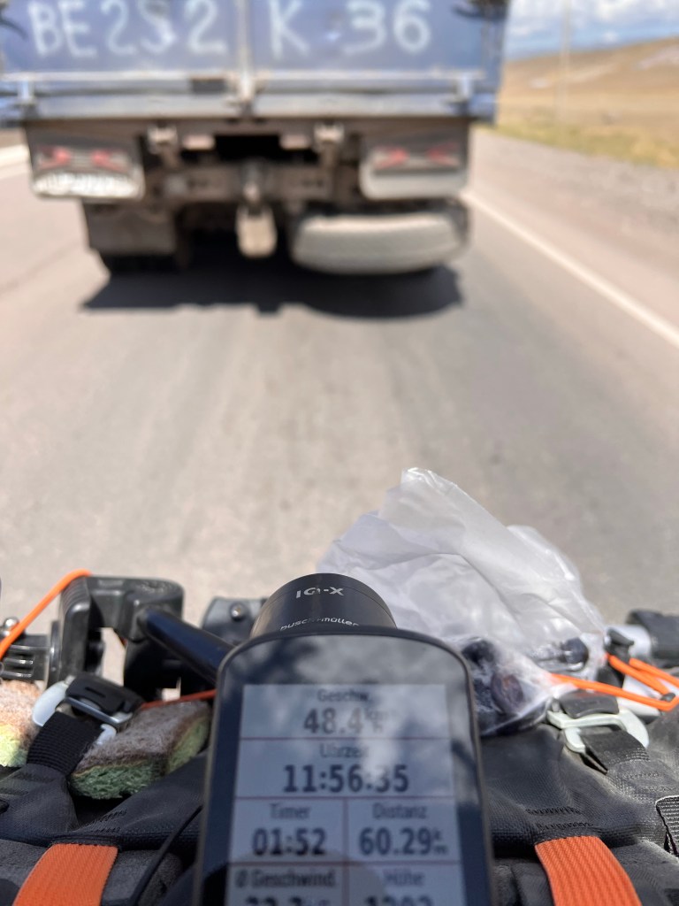 Am nächsten Tag ging es dann weiter Richtung Bishkek, auf einer sehr gut ausgebauten Schnellstraße, mit Rückenwind und leichtem Gefälle. Irgendwann überholte mich ein alter Kamaz LKW, der mit Kohle beladen war. Hier musste ich an Patrick denken, der mir auf unserer Reise eindrucksvoll gezeigt und gelehrt hat, wie effektiv es ist im Windschatten zu fahren. So klemmte ich mich hinter den LKW und fuhr die nächste Dreiviertelstunde mit knapp 50 km/h im Windschatten und machte ordentlich Kilometer gut. Der LKW gab an einem Bergaufstück den Geist auf und so ging es für mich ohne weiter. Die Straße wurde wieder breiter und der Verkehr wieder gefährlicher.