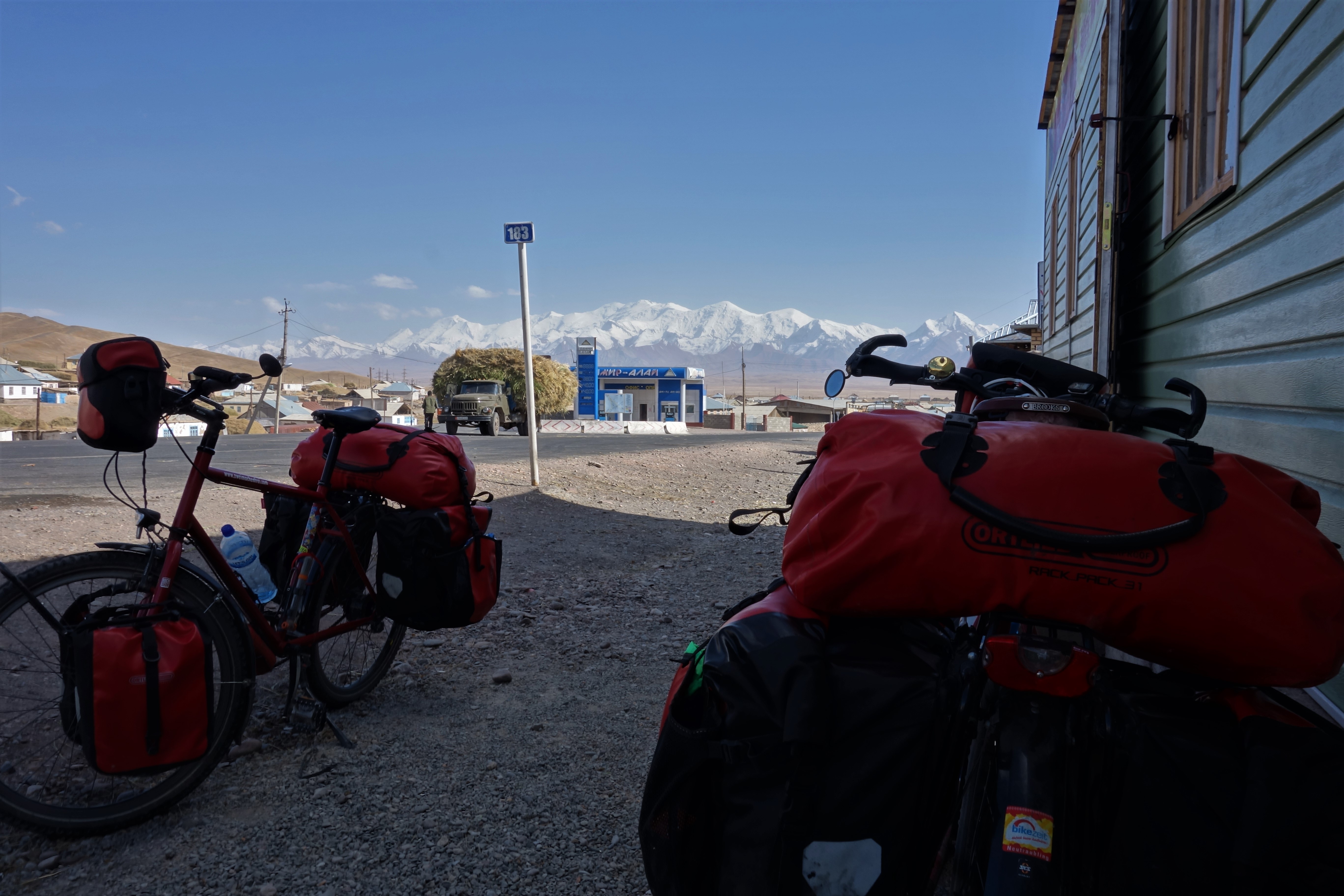 Angekommen in Sary Tash mit Blick auf die schneebedeckten Berge